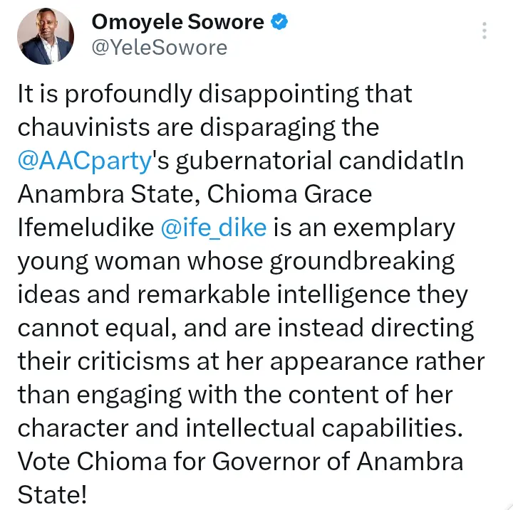 In the post that Omoyele Sowore shared on his official X handle, he said it is unfortunate that people are criticizing her appearance instead of thinking about what she has to offer.