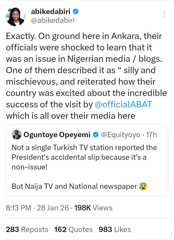 However, Abike Dabiri has now shared her thoughts after the post surfaced online. In a statement that she shared on her page, she said Turkish officials were shocked to learn that the incident was an issue in Nigeria.