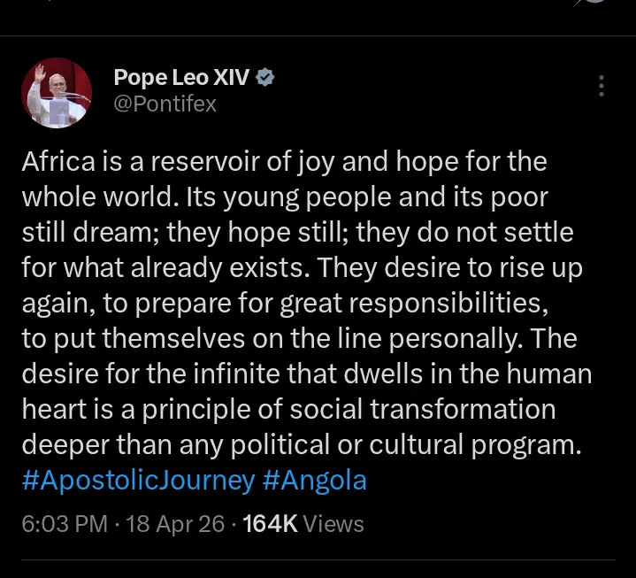 ‎In a recent statement via his official X account, Pope Leo XIV has shared a message highlighting Africa’s importance to the world, describing the continent as a place filled with hope, energy, and strong human spirit.