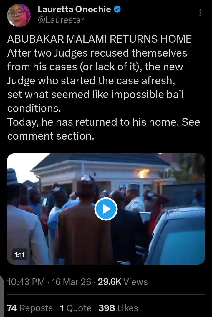 Reacting to the video, Lauretta Onochie stated that Malami has now returned home.