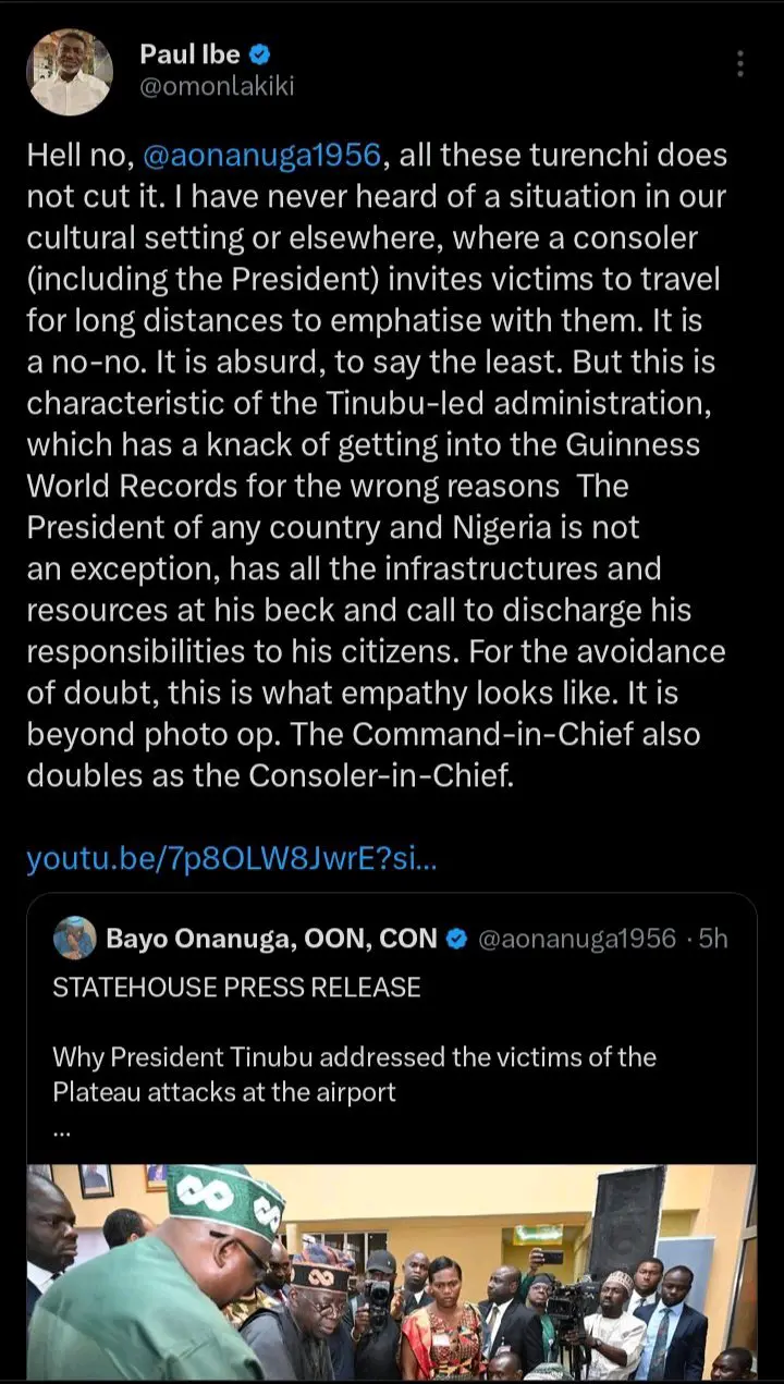 Paul Ibe, media aide to former Vice President Atiku Abubakar, has reacted to comments made by presidential spokesman Bayo Onanuga explaining why President Bola Ahmed Tinubu met victims of the recent attacks in Jos at the airport rather than visiting them elsewhere.