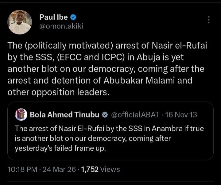 Paul Ibe, the senior special adviser on media to ADC Chieftain and Elderstateman, Atiku Abubakar recently reacted after an old tweet from President Tinubu condemning the arrest of former Kaduna State governor, Nasiru El-Rufai in Anambra State resurfaced online. According to the statements which were shared on his official X handle, he pointed out that the former governor’s arrest was politically motivated.