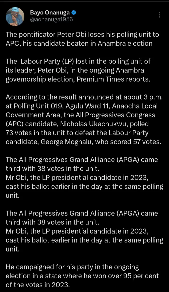 However, the lost suffered by the former Anambra governor, Peter Obi at his own polling unit caught center stage, drawing mixed reactions from different quarters, including from Bayo Onanuga, the senior special adviser on Information and Strategy.