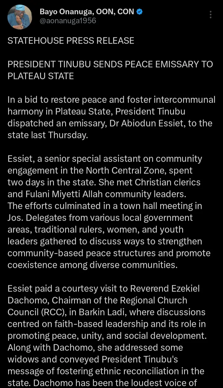 Bayo Onanuga, the senior special adviser on Information and Strategy has taken to his official X handle to react after President Tinubu sent a high profile emissary to Plateau State to mediate between Christian clerics and Miyetti Allah community leaders. According to the statements which were shared on his official X handle, he pointed out that Reverend Ezekiel Dachomo was in attendance.