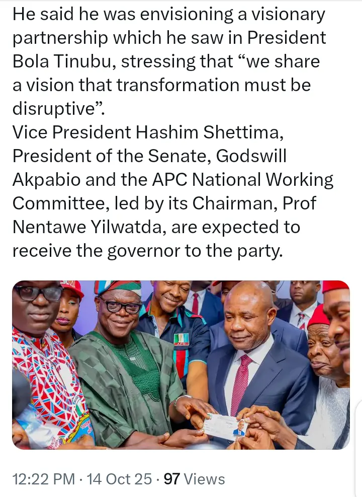 Bayo Onanuga said that the Vice President of Nigeria, Kashim Shettima, Senate President, Godswill Akpabio, National Chairman of the All Progressive Congress, APC, Nentawe Yilwatda and several other chieftains of the party are expected to receive the governor of Enugu state into APC. See, More, Here>>>
