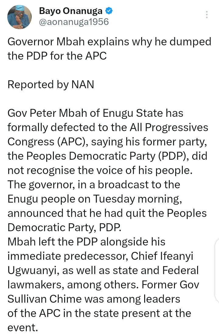 Bayo Onanuga, the Special Adviser to President Bola Ahmed Tinubu on Information and Strategy has reacted after the governor of Enugu state, Peter Mbah explained the reason why he joined the All Progressive Congress, APC.