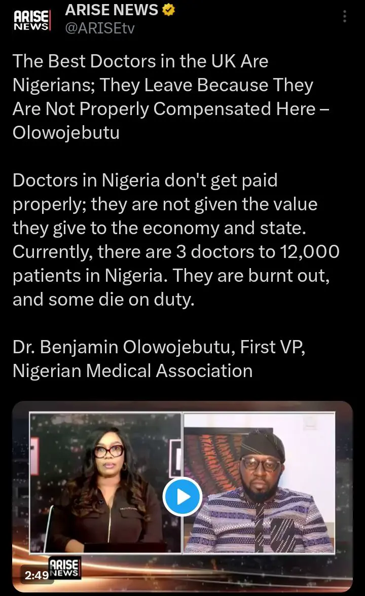 Olowojebutu made the remarks while speaking on Arise Newsnight on Tuesday, where he addressed the ongoing shortage of medical practitioners in Nigeria and the looming threat of industrial action by doctors.