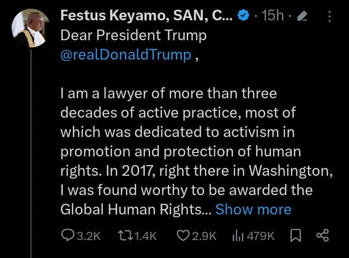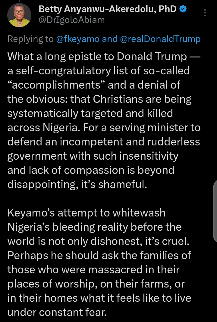 Betty Akeredolu, the widow of former governor of Ondo state, Rotimi Akeredolu has taken to her official X account on Thursday, November 6, 2025 to react to the letter that the Minister of Aviation and Aerospace Development, Festus Keyamo wrote to the US President, Donald Trump.