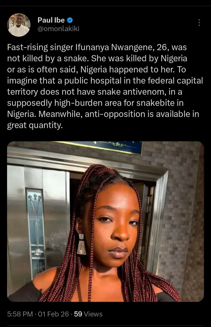 Paul Ibe, the senior special adviser on media to ADC Chieftain and Elderstateman, Atiku Abubakar has taken to his official X handle to react to the death of popular singer, Ifunanya Nwangene. According to the statements which were shared on his official X handle, he pointed out that the fast rising music star’s death was not caused by the snake bite.