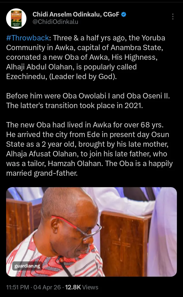 According to his statements, he pointed out that in 2023, a Yoruba community in Awka, the capital of Anambra State installed a new traditional ruler, Oba Alhaji Abdul Olahan. The Oba, according to Chidi Odinkalu, was fondly called ‘Ezechinedu’.