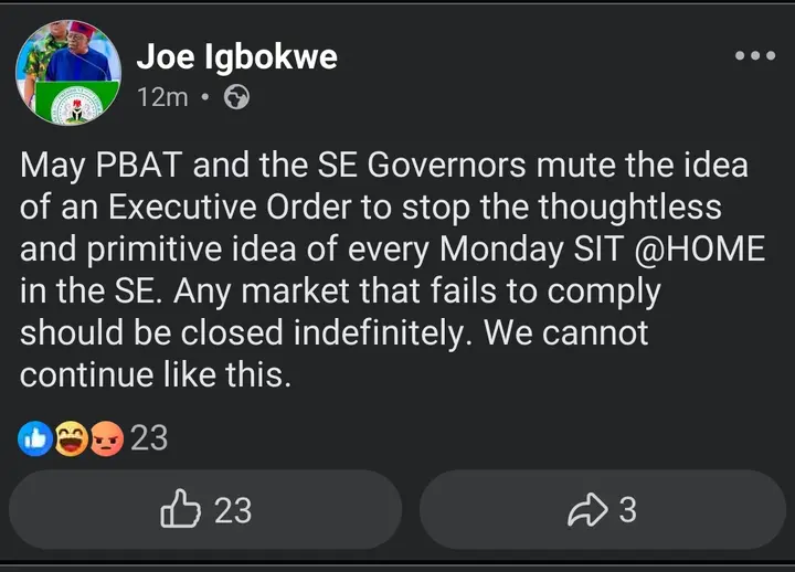 “May PBAT and the SE Governors mute the idea of an Executive Order to stop the thoughtless and primitive idea of every Monday SIT At HOME in the SE. Any market that fails to comply should be closed indefinitely. We cannot continue like this,” Igbokwe wrote.