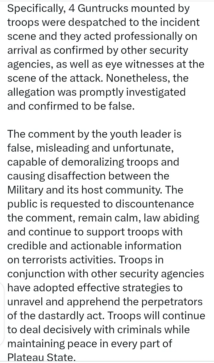 The Nigerian Army has reacted to the claim of one of the youth leaders in Jos that some soldiers protected terrorists who attacked them in the community.