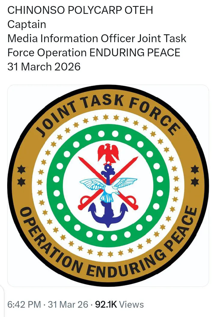 The reaction of the Nigerian Army was contained in a post that was shared on its official X handle on March 31, 2026.