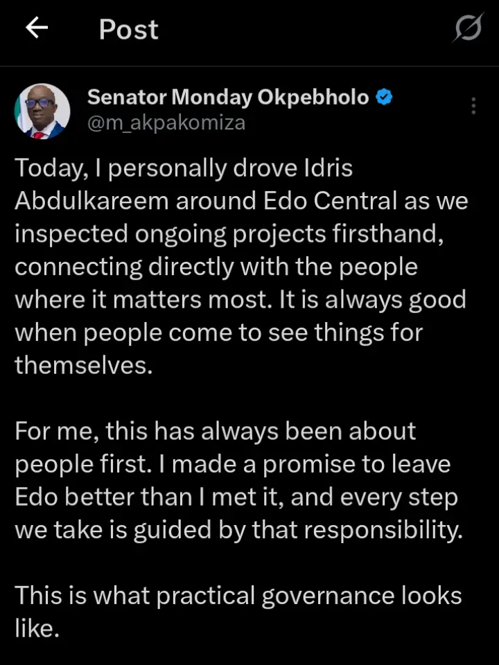 The executive Governor of Edo State and chieftain of the All Progressives Congress, Senator Monday Okpebholo stated on his verified Twitter page on Monday; “Today, I personally drove Idris Abdulkareem around Edo Central as we inspected ongoing projects firsthand, connecting directly with the people where it matters most. It is always good when people come to see things for themselves.”