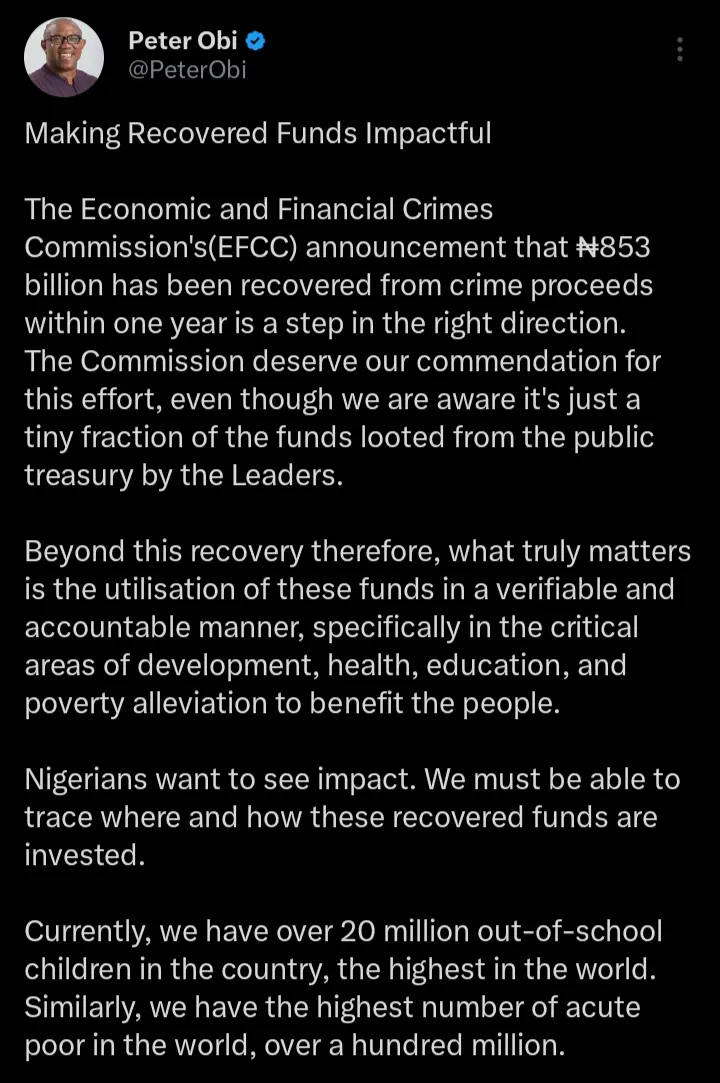 The former governor of Anambra State and erstwhile Labour Party presidential candidate, Peter Obi has taken to his official X handle to commend the Economic and Financial Crimes Commission, EFCC for recovering over eight hundred billion from criminal activities. According to his statements which drew widespread attention from the general public, he pointed out that the recovered funds must be used to make impact.