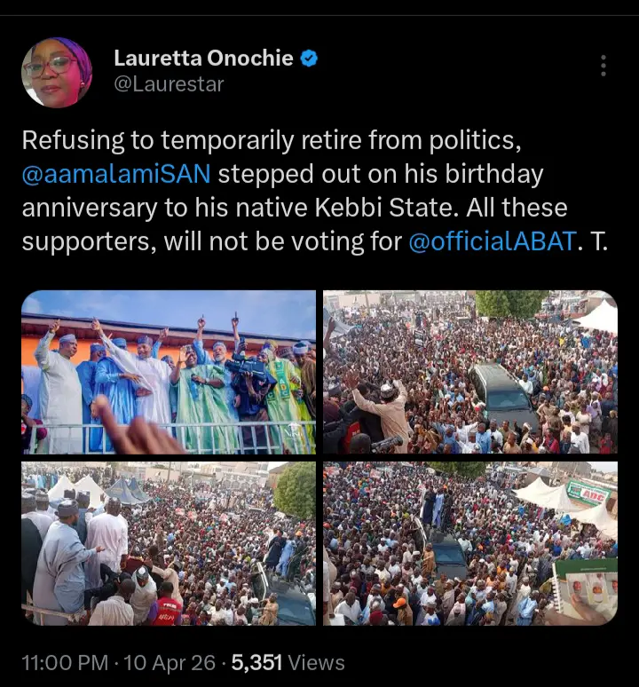 “Refusing to temporarily retire from politics, Malami stepped out on his birthday anniversary to his native Kebbi State. All these supporters, will not be voting for Bola Tinubu.” She wrote. Read_More…