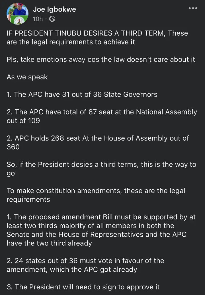 In the post, Igbokwe argued that the current political structure in Nigeria places the ruling All Progressives Congress (APC) in a strong position to influence constitutional changes. He pointed to the party’s dominance across key levels of government, including control of a majority of state governments and significant representation in the National Assembly.