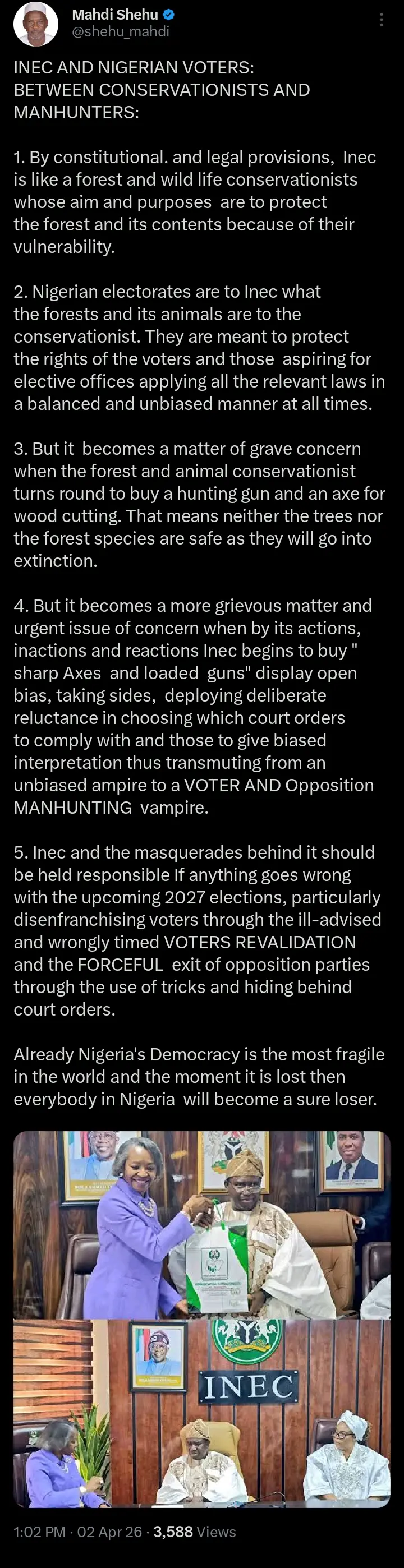 In a recent statement via his official X account, public affairs analyst, Mahdi Shehu has expressed concern about the role of the Independent National Electoral Commission (INEC) in Nigeria’s democratic process, questioning the commission’s neutrality and commitment to protecting voters’ rights.