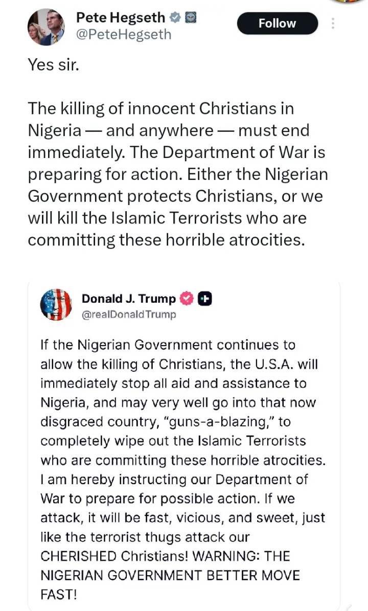Reacting, Pete Hegseth stated that the Department of War is preparing for action. He said the Nigerian govenment must protect Christians or the terrorists will be killed.