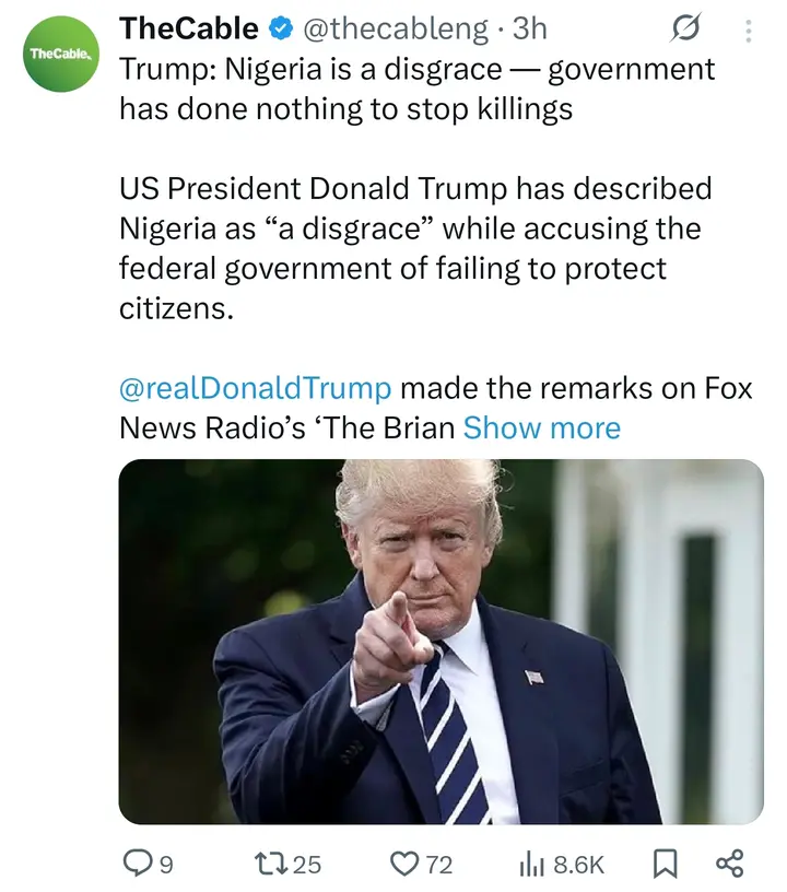 According to the Cable report on Saturday November 22, 2025, United States President Donald Trump described Nigeria as “a disgrace” during an interview on Fox News Radio’s ‘The Brian Kilmeade Show’ on November 21, 2025, accusing the federal government of failing to protect its citizens from widespread killings. He characterized the situation as a “genocide,” stating, “They’re killing people by the thousands. And I’m really angry about it.”
