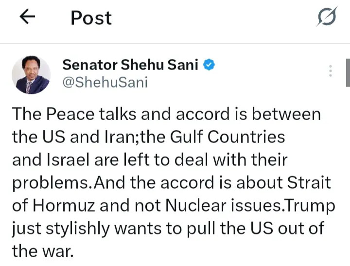 In a post shared on his X (formerly Twitter) handle on Monday, April 6, 2026, Sani argued that the peace talks between the U.S. and Iran are not centered on nuclear weapons, as widely perceived, but rather on restoring access to the Strait of Hormuz, a critical global oil transit route.