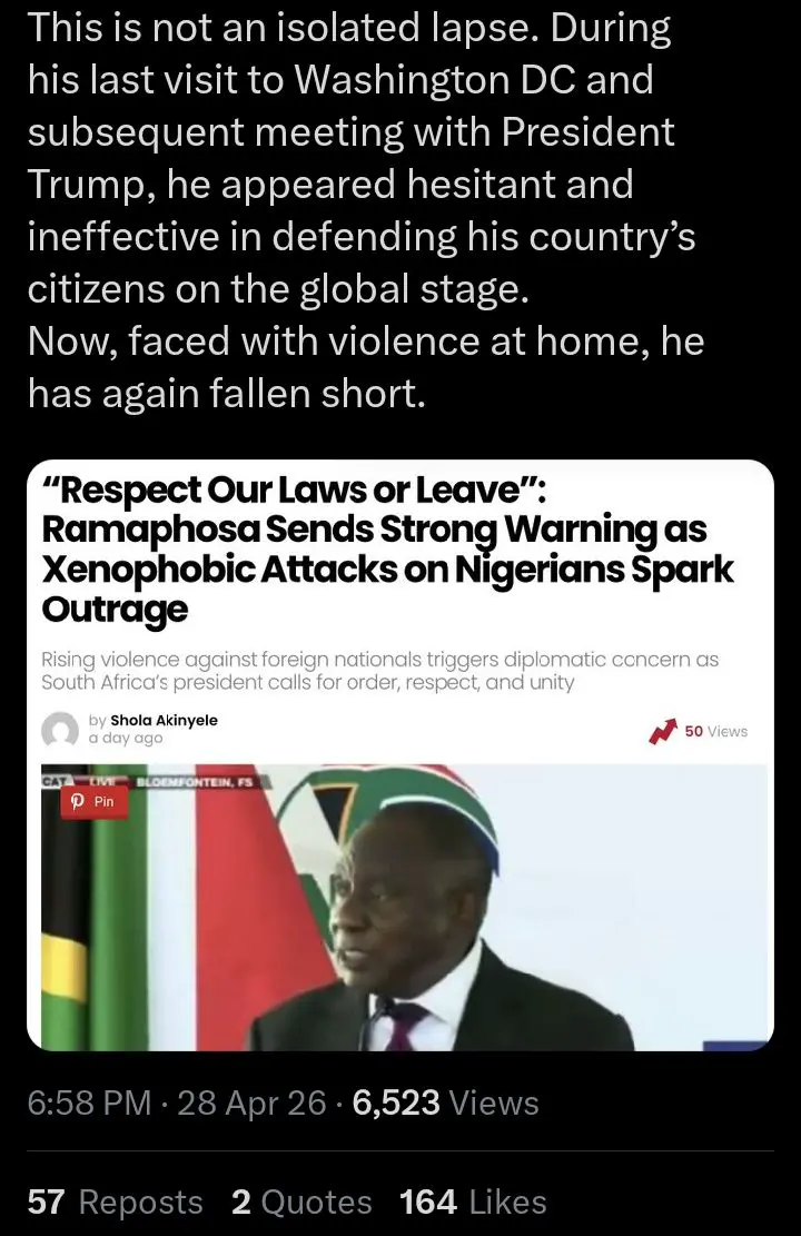 He further argued that the development is not an isolated incident, accusing Ramaphosa of previously showing weakness on the global stage. Sowore referenced the South African leader’s past engagement in Washington, D.C., including a meeting with former U.S. President, Donald Trump, where he claimed Ramaphosa appeared hesitant in defending his country’s interests.