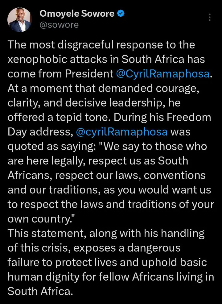 “At a moment that demanded courage, clarity, and decisive leadership, he offered a tepid tone,” Sowore stated, adding that the response was inadequate given the severity of xenophobic violence reported in parts of the country.