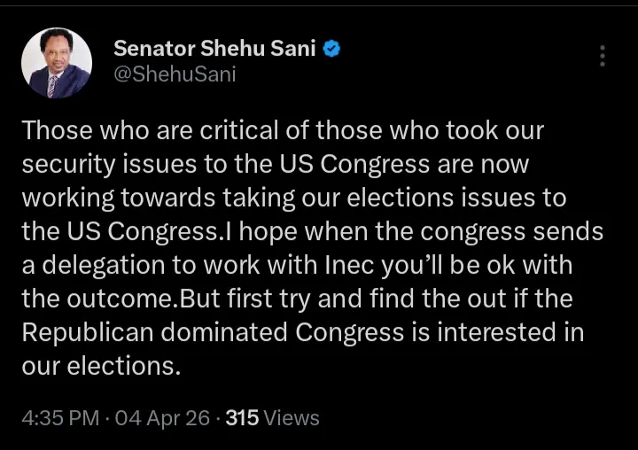Shehu Sani, a respected human rights activist and former Kaduna central senatorial district lawmaker has taken to his official X handle to make a remarkable comment regarding the reports circulating on media platforms that INEC was being closely monitored by the United States. According to the statements which were shared on his official X handle, he pointed out that the people might not be satisfied with external interference.
