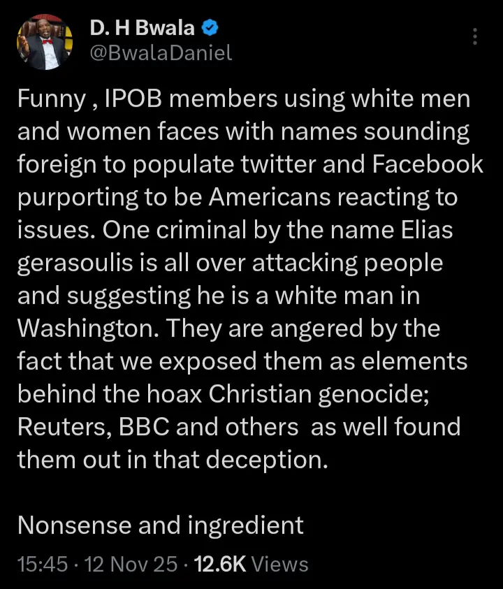 He alleged these accounts, including one purportedly impersonating U.S. lobbyist Elias Gerasoulis, aim to promote a narrative of “Christian genocide” in Nigeria, which he labeled a hoax.