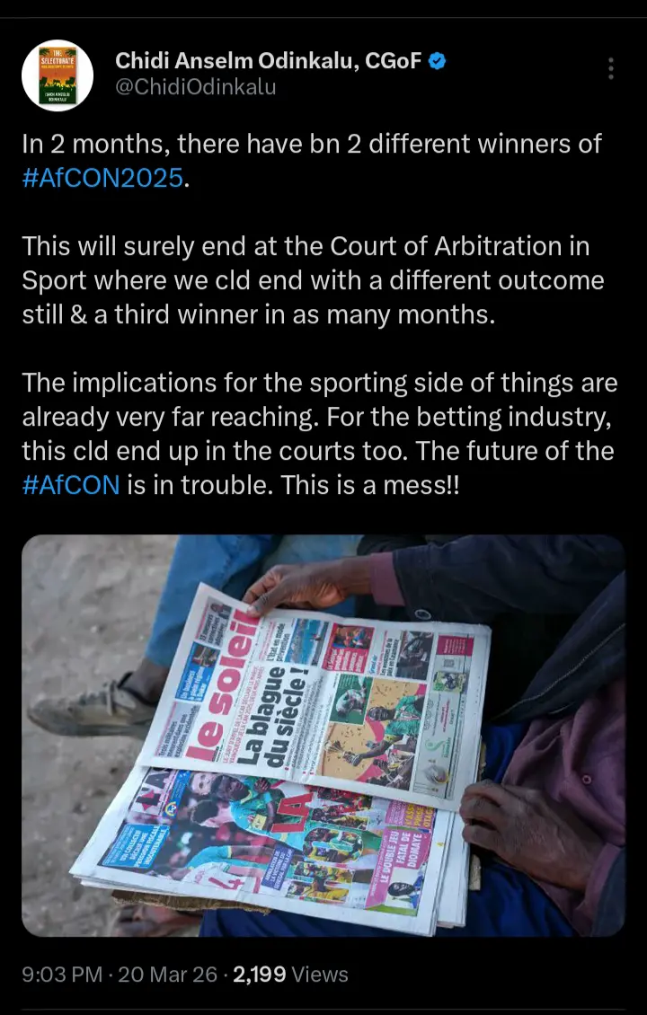 Chidi Odinkalu, a renowned human rights activist and legal practitioner has taken to his official X handle to react after the Confederation of African Football, CAF stripped the AFCON trophy from the Senegalese national team and awarded it to Morocco. According to the statements which were shared on his official X handle, he pointed out that the future of the tournament was in trouble.
