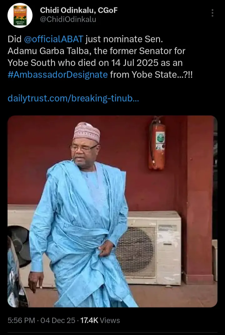 Senator Garba Talba, a respected lawmaker passed away on the 14th of July 2025 after a brief illness. However, his nomination, which came as a shock to many, caught the attention of Chidi Odinkalu, a respected human rights activist and legal practitioner.