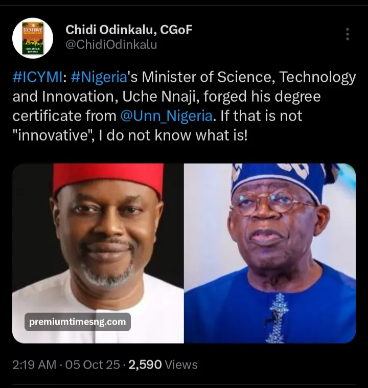 “Nigeria’s Minister of Science, Technology and Innovation, Uche Nnaji, forged his degree certificate from UNN. If that is not innovative, I do not know what is!” He wrote. See, More, Here>>>
