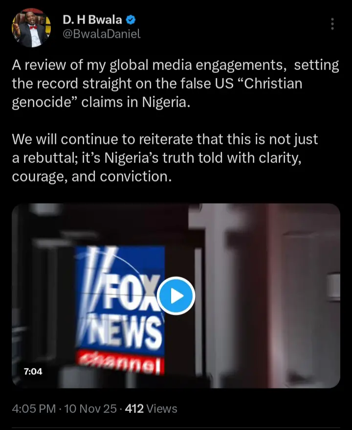 Daniel Bwala, the senior special adviser on media and policy communications has taken to his official X handle on Monday November 10th, 2025 to react after he appeared on international television outlet, Fox News to dismiss claims of Christian genocide in Nigeria. According to the statements which were shared on his official X handle, he pointed out that his comments were not just rebuttal, but the actual truth.