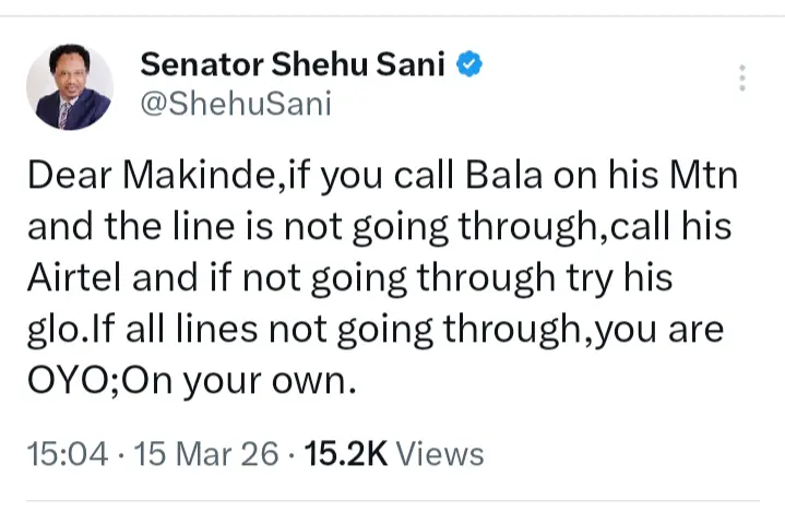 Sani wrote, “Dear Makinde, if you call Bala on his Mtn and the line is not going through,call his Airtel and if not going through try his glo. If all lines not going through, you are OYO; On your own.”