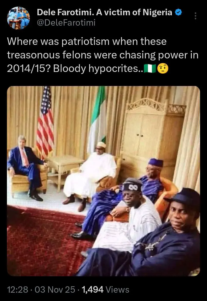 Farotimi’s post questions the consistency of these leaders’ actions, referencing their past interactions with foreign officials amid Nigeria’s political landscape.