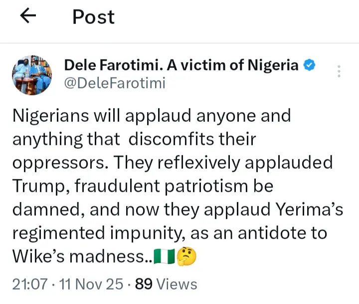 He wrote “Nigerians will applaud anyone and anything that discomforts their oppressors. They reflexively applauded Trump, fraudulent patriotism be damned, and now they applaud Yerima’s regimented impunity, as an antidote to Wike’s madness.”