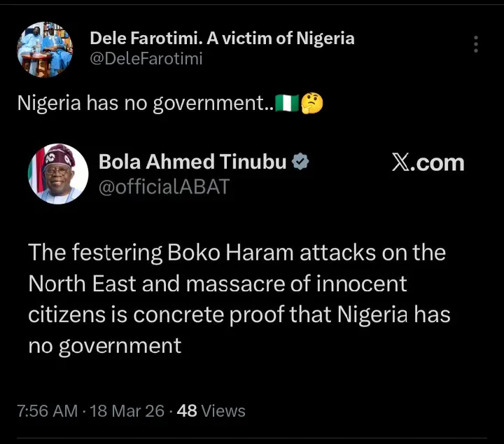 Reacting on his official X handle on Wednesday, March 17th, 2026, Farotimi affirmed the President’s observation. “Indeed, the government is non-existent,” he wrote, echoing Tinubu’s sentiments on the worsening security situation.
