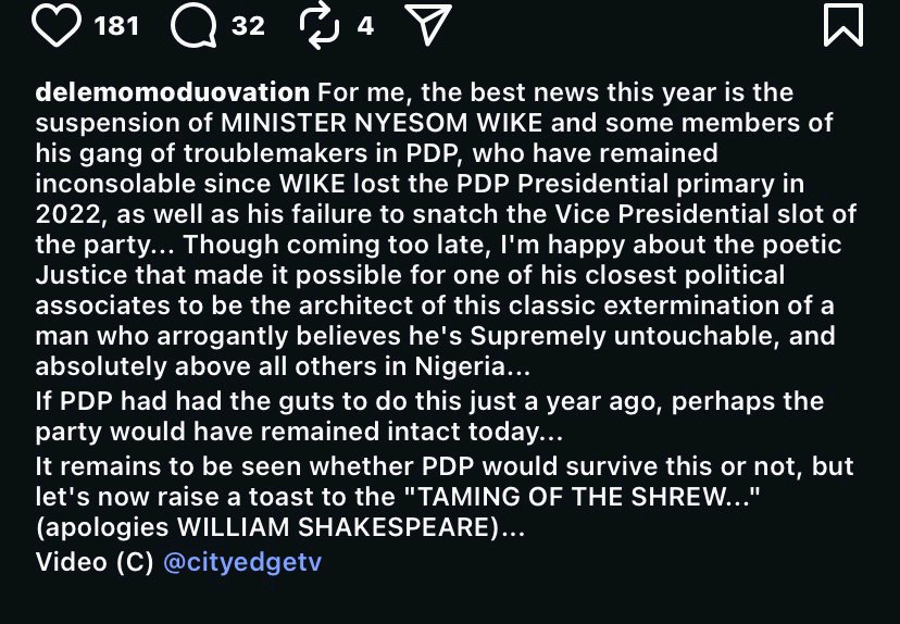 He added that the PDP might have avoided internal collapse if the suspension had been issued earlier: “If PDP had had the guts to do this just a year ago, perhaps the party would have remained intact today…”Momodu noted that the future of the PDP remains uncertain following the internal disciplinary actions: “It remains to be seen whether PDP would survive this or not, but let’s now raise a toast to the ‘TAMING OF THE SHREW…’ (apologies WILLIAM SHAKESPEARE)…’’ View, More,