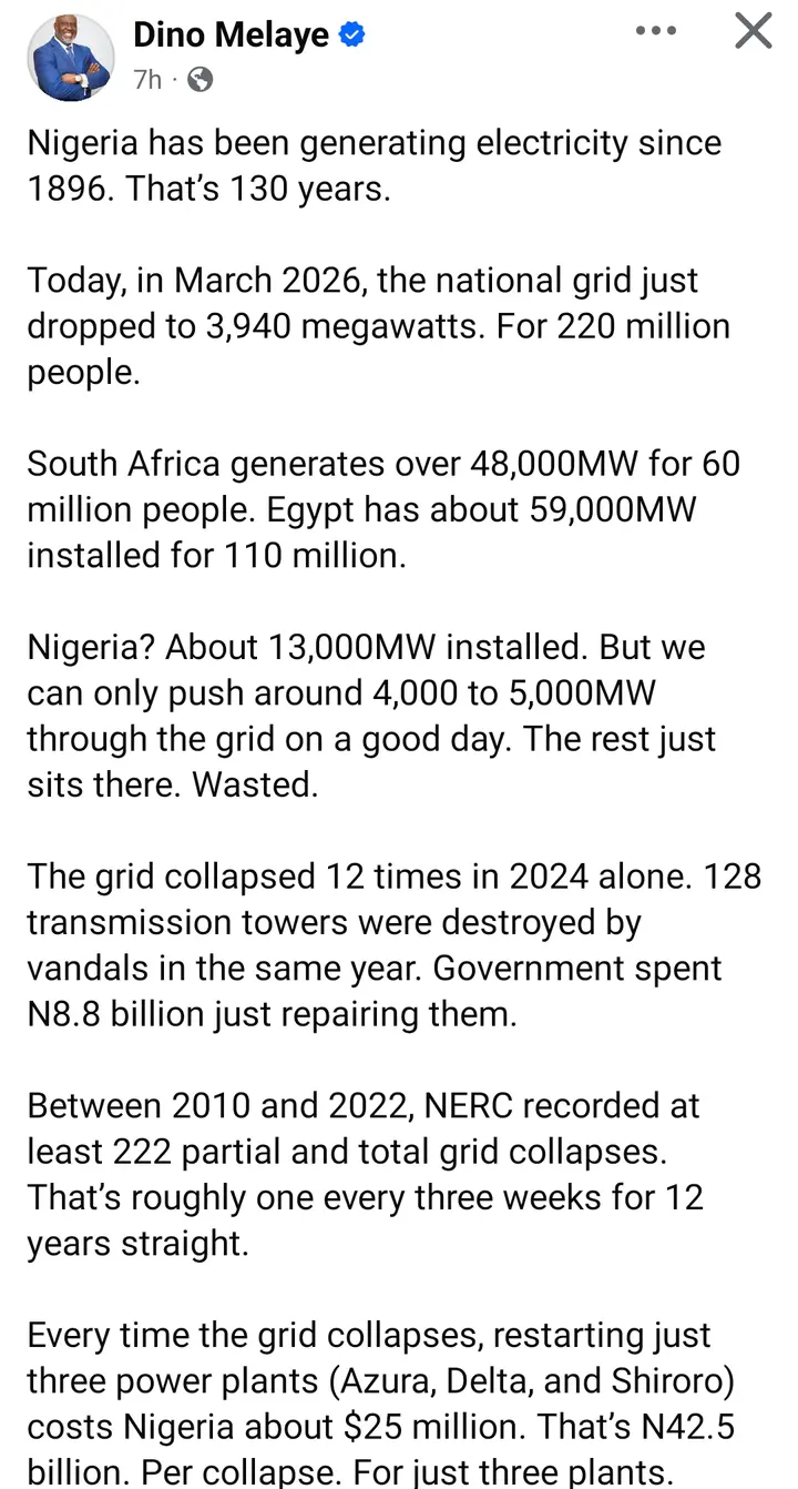 In a Facebook post on March 25, 2026, Melaye noted that although Nigeria began generating electricity as far back as 1896, the country continues to struggle with inadequate supply. He pointed out that as of March 2026, the national grid was producing only about 3,940 megawatts for an estimated population of 220 million people.