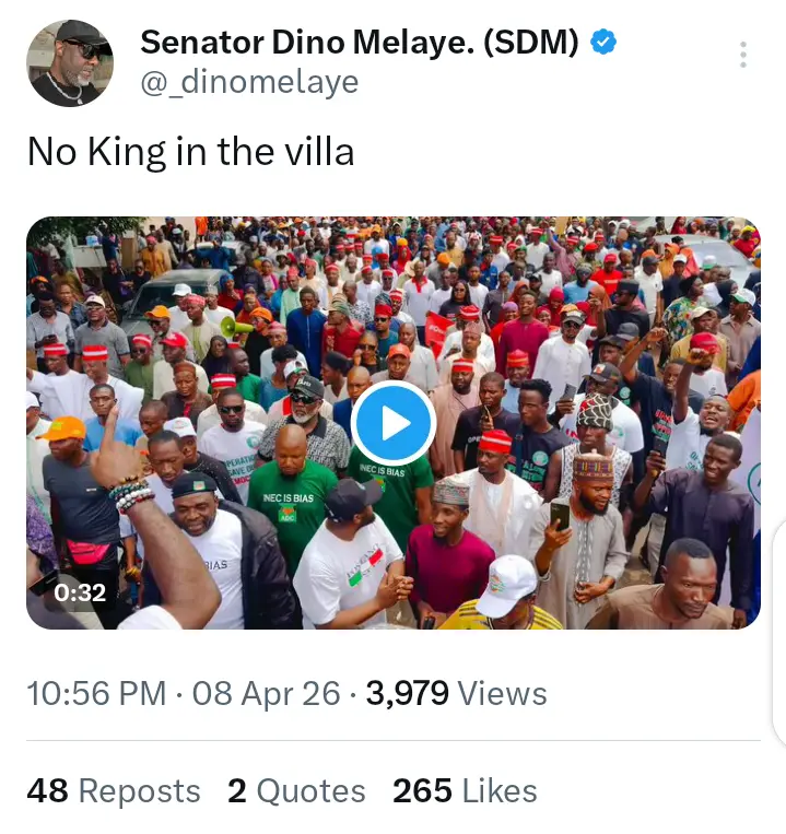 The reaction of Senator Dino Melaye was contained in a post that he shared on his official X handle on April 8, 2026. This is coming after Dino Melaye and several leaders of the African Democratic Congress stormed the office of the Independent National Electoral Commission, INEC to protest the removal of names of some ADC leaders from portal.