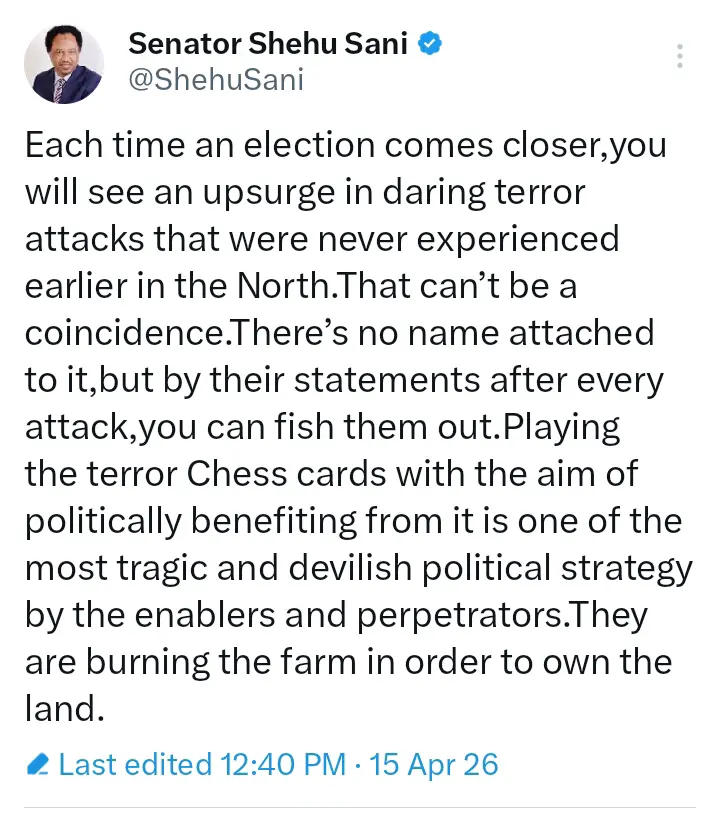 In a post via X, Sani believes that beyond the violence itself, the timing raises serious questions. According to him, statements and reactions that follow these attacks sometimes reveal hidden motives or suggest that certain groups may benefit politically from the chaos. He warned that using insecurity as a strategy to gain power is dangerous and harmful to the country.