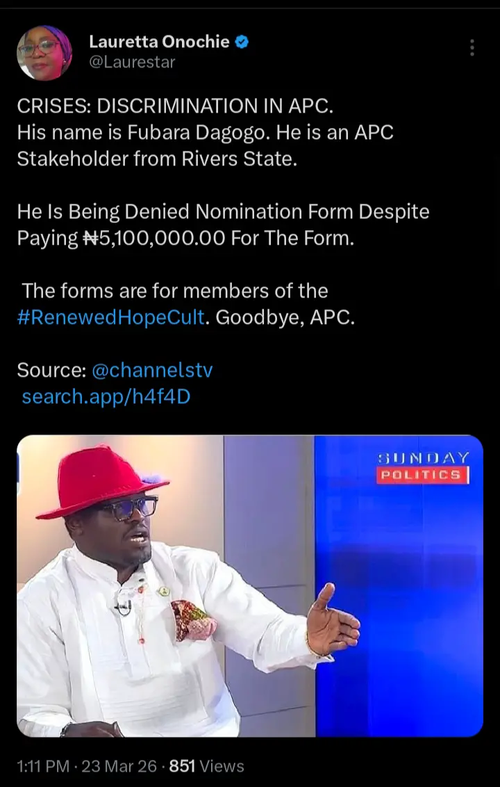 Lauretta Onochie, a Chieftain of the African Democratic Congress, ADC and former presidential aide has taken to her official X handle to react after a Rivers State APC member identified as Fubara Dagogo was denied nomination form. According to the statements which were shared on her official X handle, she disclosed the reasons why he was denied the nomination form.