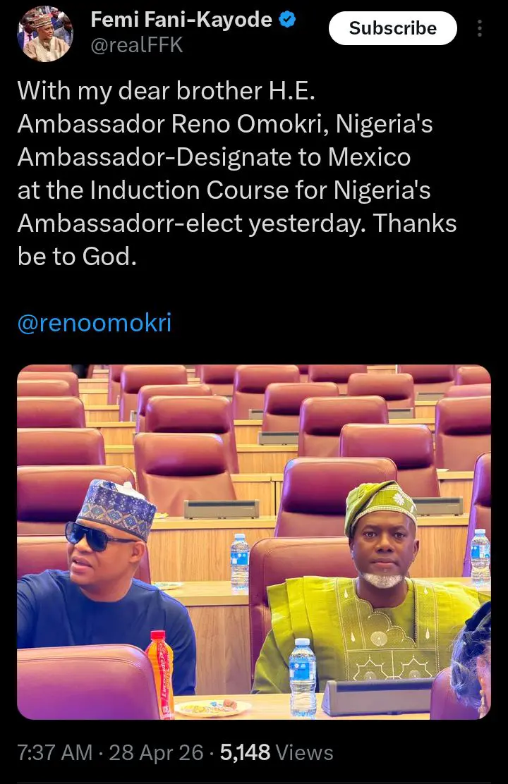 Former Minister of Aviation and Ambassador-designate to Germany, Femi Fani-Kayode, has reacted after being pictured alongside Reno Omokri at an induction ceremony for Nigeria’s ambassador-designates.