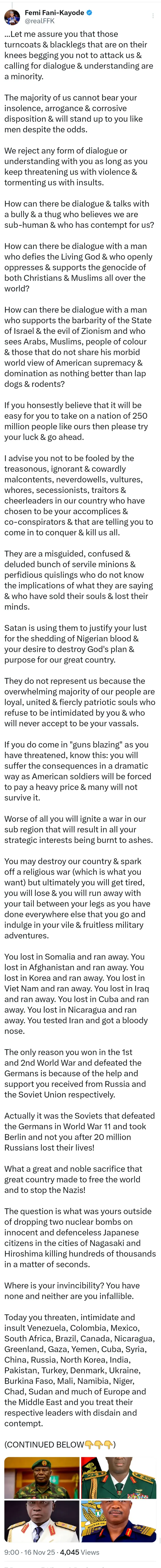 “The majority of us,” he wrote, “cannot bear your insolence, arrogance, and corrosive disposition. We will stand up to you like men, despite the odds.” According to Fani-Kayode, Nigerians will not submit to intimidation or threats, and any attempt to coerce the nation will be met with resilience and defiance.