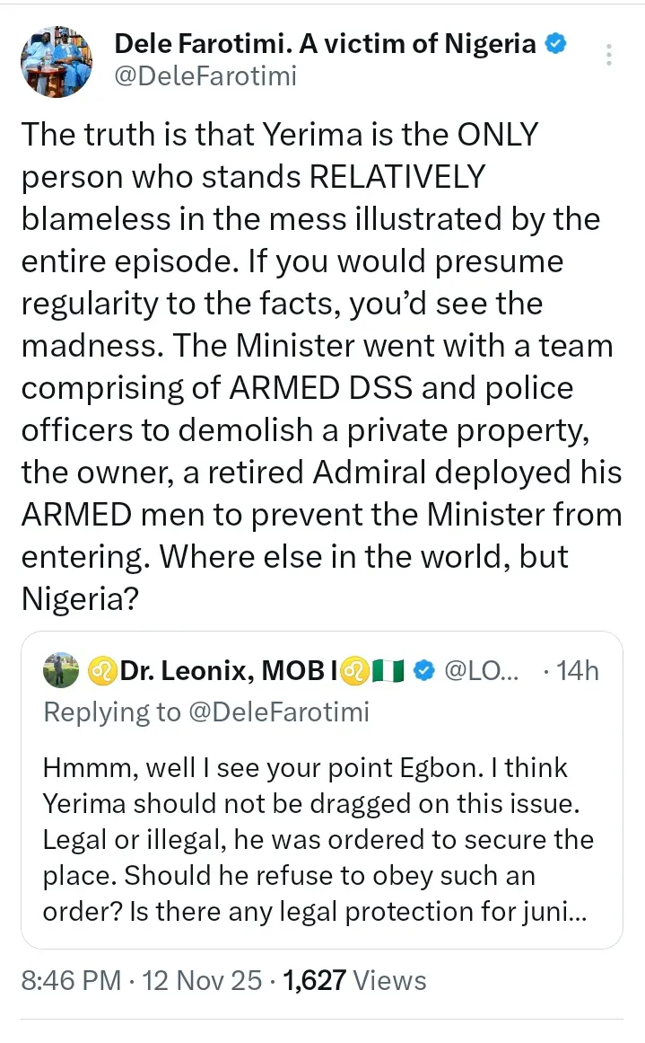 Reacting to the incident via X, legal expert and activist Dele Farotimi said the situation exposed deeper issues of disorder in the country. He pointed out that Wike arrived with an armed team to demolish a private property without clear legal steps being followed. Meanwhile, the property owner, a retired admiral, also sent armed military men to stop the action, leading to the standoff.