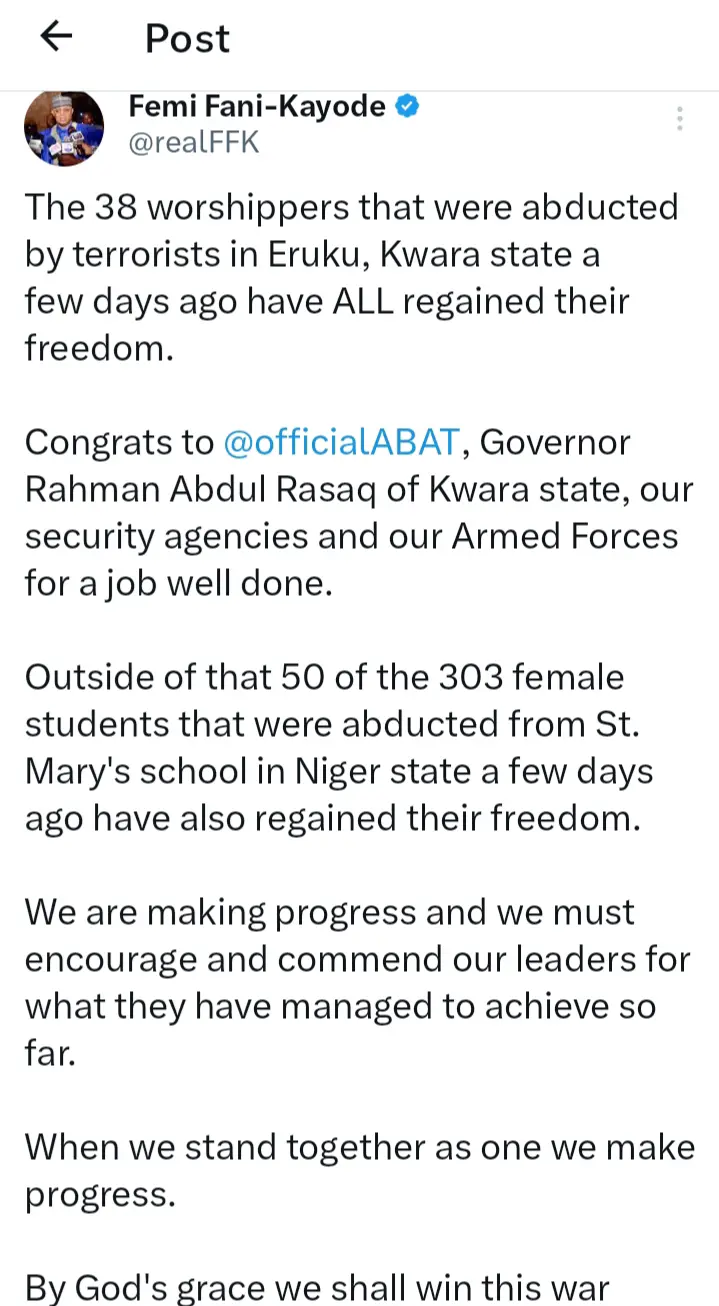Former Aviation Minister, Femi Fani-Kayode, has applauded recent breakthroughs in Nigeria’s fight against insecurity, celebrating the release of abducted victims in Kwara and Niger states. In a post shared on his official X handle on Sunday, November 23, 2025, Fani-Kayode described the developments as significant progress in the ongoing battle against terrorism.