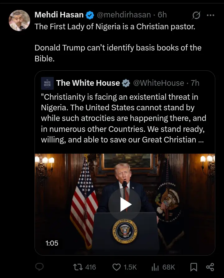 The post quickly went viral, drawing mixed reactions online. Some praised Hasan for calling out what they described as Trump’s performative religiosity and political exploitation of faith. however, criticized the journalist for trivializing the very real security and religious tensions in Nigeria, where violent attacks against Christian and Muslim communities persist. View, More,