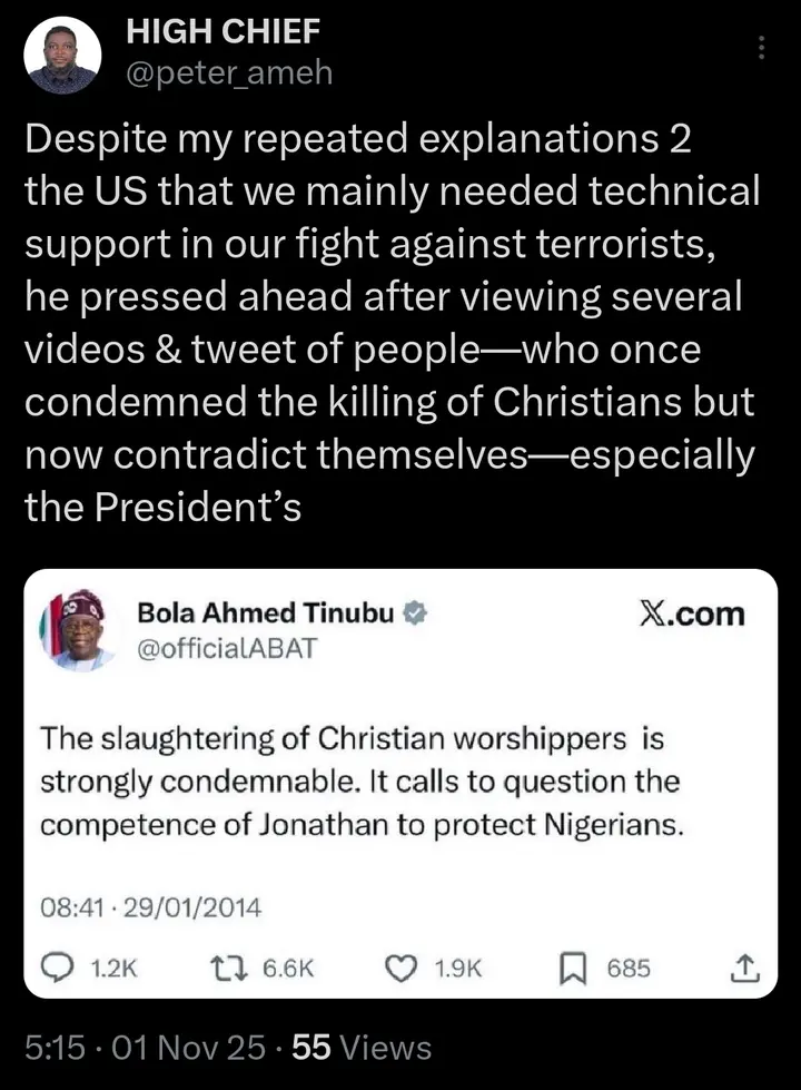 Former presidential candidate and former National Chairman of the Inter-Party Advisory Council (IPAC), Peter Ameh, has reacted to a resurfaced tweet by President Bola Tinubu condemning the killing of Christians in Nigeria.