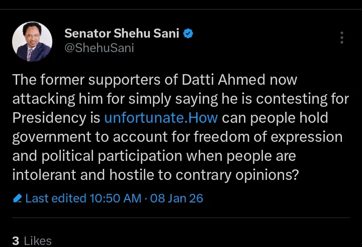 Reacting, Senator Shehu Sani, a renowned human rights activist and former federal lawmaker in a recent statement which was shared on his official X handle, slammed the antics of those against Datti’s ambitions.
