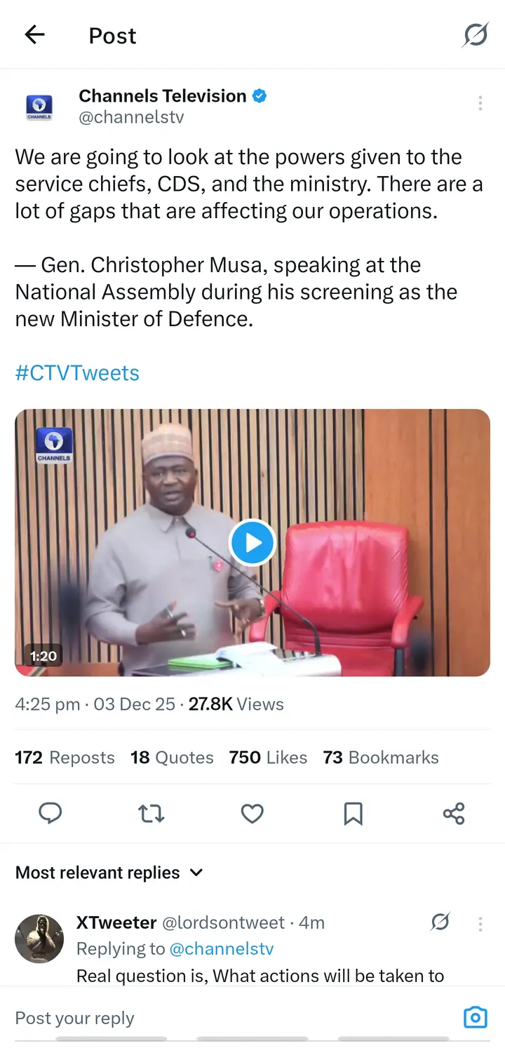 According to the Channels Television report on Wednesday December 3, 2025, during his confirmation hearing before the National Assembly as Nigeria’s newly appointed Minister of Defence, General Christopher Musa underscored the imperative for a constitutional review of the powers vested in the service chiefs, the Chief of Defence Staff (CDS), and the Ministry of Defence.